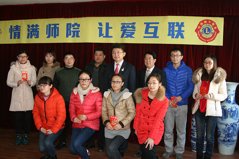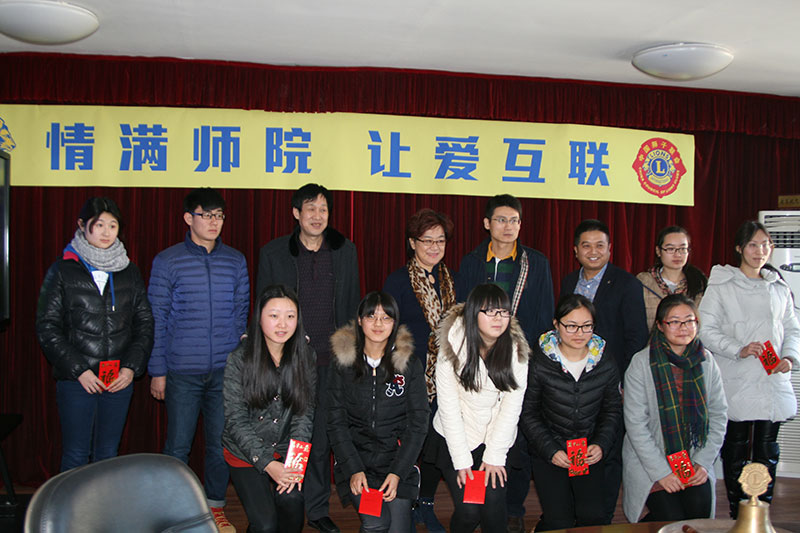 1月19日下午两点,中国狮子会“醒狮”奖(助)学金捐赠暨颁发仪式在师范学院办公楼三楼会议室举行。中国狮子联会青岛会员管理委员会2015-2016年度主席马宣狮兄、校学生处吴世珍处长、师范学院陶明达副院长以及青岛狮子会各位狮友代表和20名获资助同学参加了此次仪式。仪式由师范学院学工办主任赵炜主持。