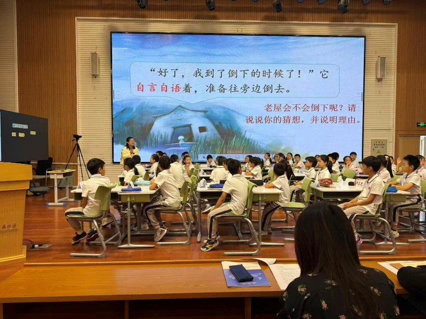课堂上,王老师以童话文本为载体,紧扣“培养阅读理解与情感共情能力”目标,通过引导学生分组朗读老屋与小猫、老母鸡、小蜘蛛的对话,让学生感受角色语气中的温柔与坚定;再借助思维导图梳理“老屋多次准备倒下却坚持帮助他人”的情节脉络,整堂课氛围轻松活泼。