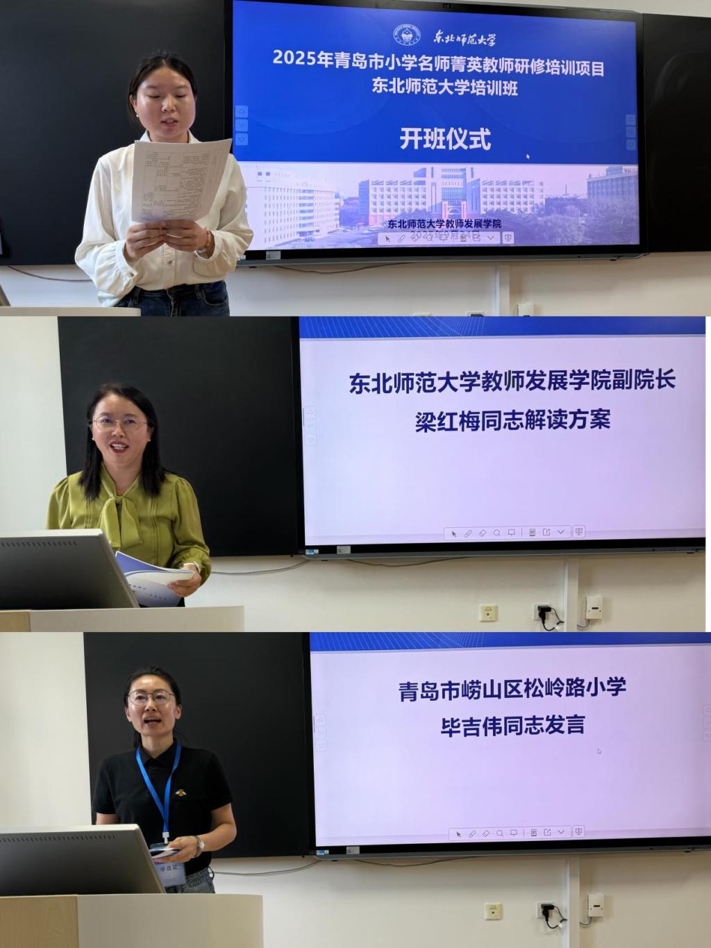 开班仪式由东北师范大学教师发展学院刘媛媛老师主持。仪式伊始,东北师范大学教师发展学院院长陈欣、青岛大学教育科学学院党委书记刘清亮分别致辞,希望参训教师立足“育人初心”与“专业成长”双重视角,努力成为观念新、懂教育、会教学、擅科研的名师。随后,东北师范大学教师发展学院副院长梁红梅解读此次研修活动方案,青岛市崂山区松岭路小学毕吉伟老师作为学员代表进行发言,她结合基层教学实践需求表达对此次研修活动的热切期待。
